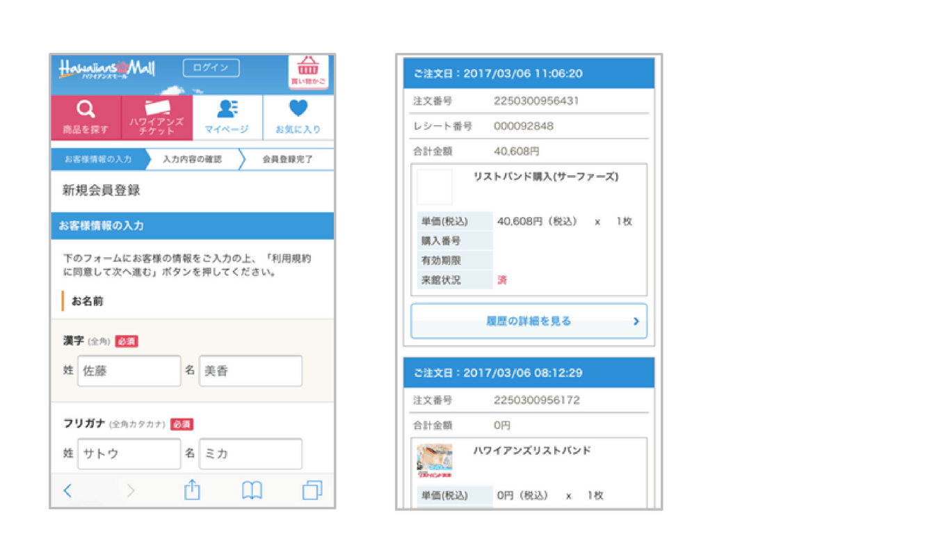 . ▲リストバンド申込画面 ▲購入履歴画面