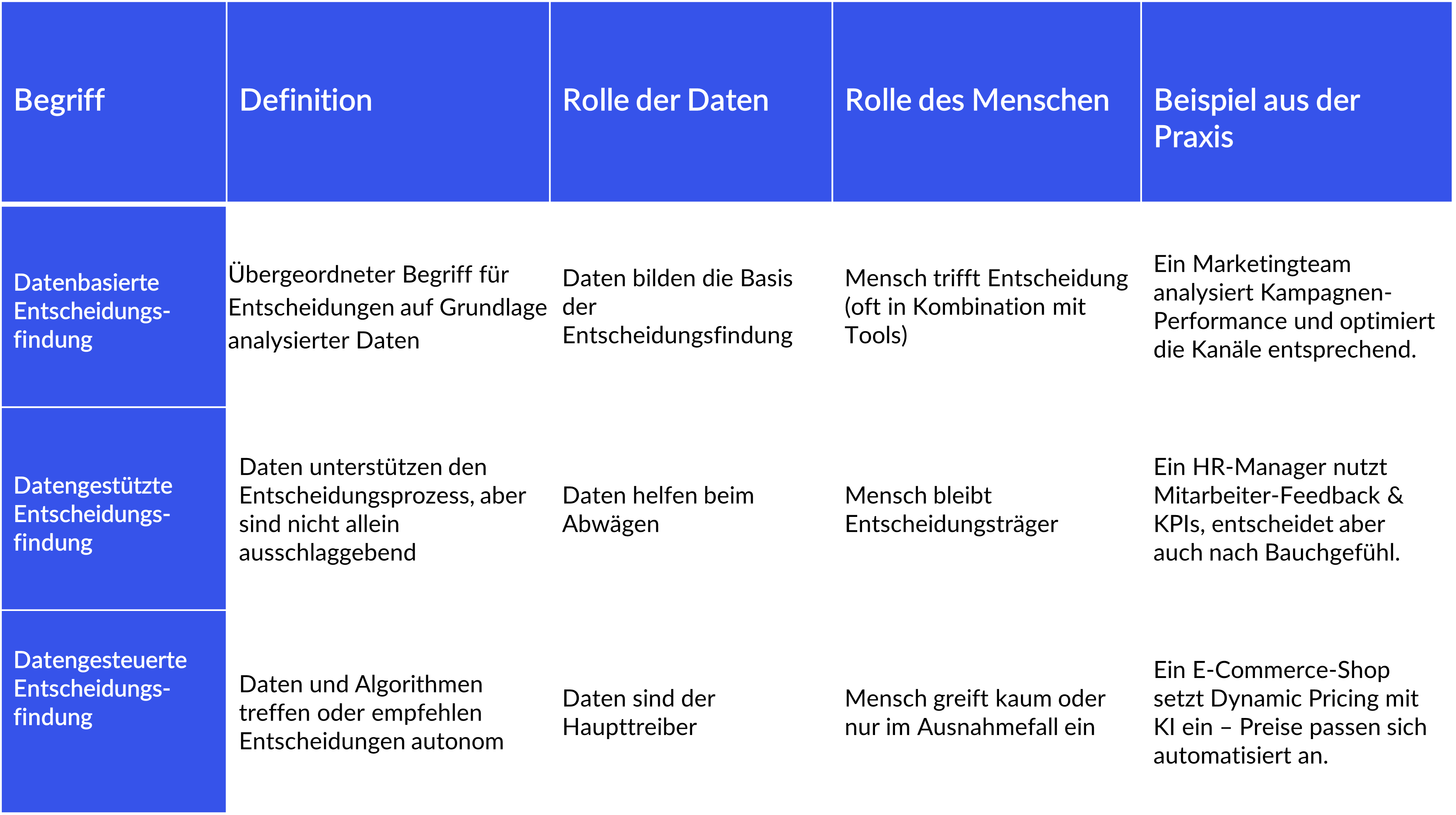 - Datenbasierte Entscheidungsfindung als Oberbegriff, der alle Formen der datengeleiteten Entscheidungsfindung umfasst.