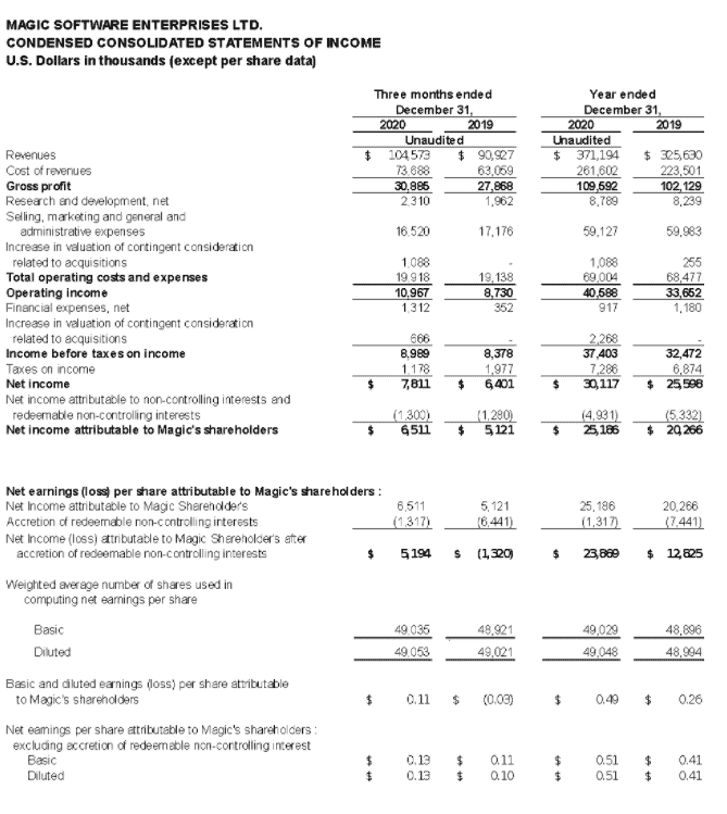 - Net income attributable to Magic’s shareholders for the year increased 24% to $25.2 million, or $0.49 per fully diluted share, compared to $20.3 million, or $0.26 per fully diluted share in the same period last year. Earnings per share for the year ended December 31, 2020 and 2019, were negatively impacted by accretion charges of $1.3 million and $7.4 million, respectively, with respect to the value of outstanding put options of redeemable non-controlling interests.