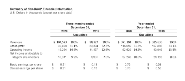 “For the full year of 2020, Magic’s revenues increased 14% year over year to $371 million and non-GAAP operating income increased 20% year over year to $53 million. Focusing on growth strategy, offering diversity and an even stronger balance sheet, Magic continues to be well positioned for future success and growth.”