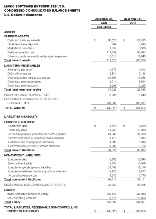 - As of December 31, 2020, Magic’s net cash, cash equivalents, short and long-term bank deposits and marketable securities amounted to $92.0 million.