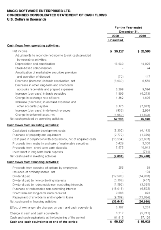 - Cash flow from operating activities for the year ended December 31, 2020 amounted to $52.3 million compared to $45.9 million in the same period last year.