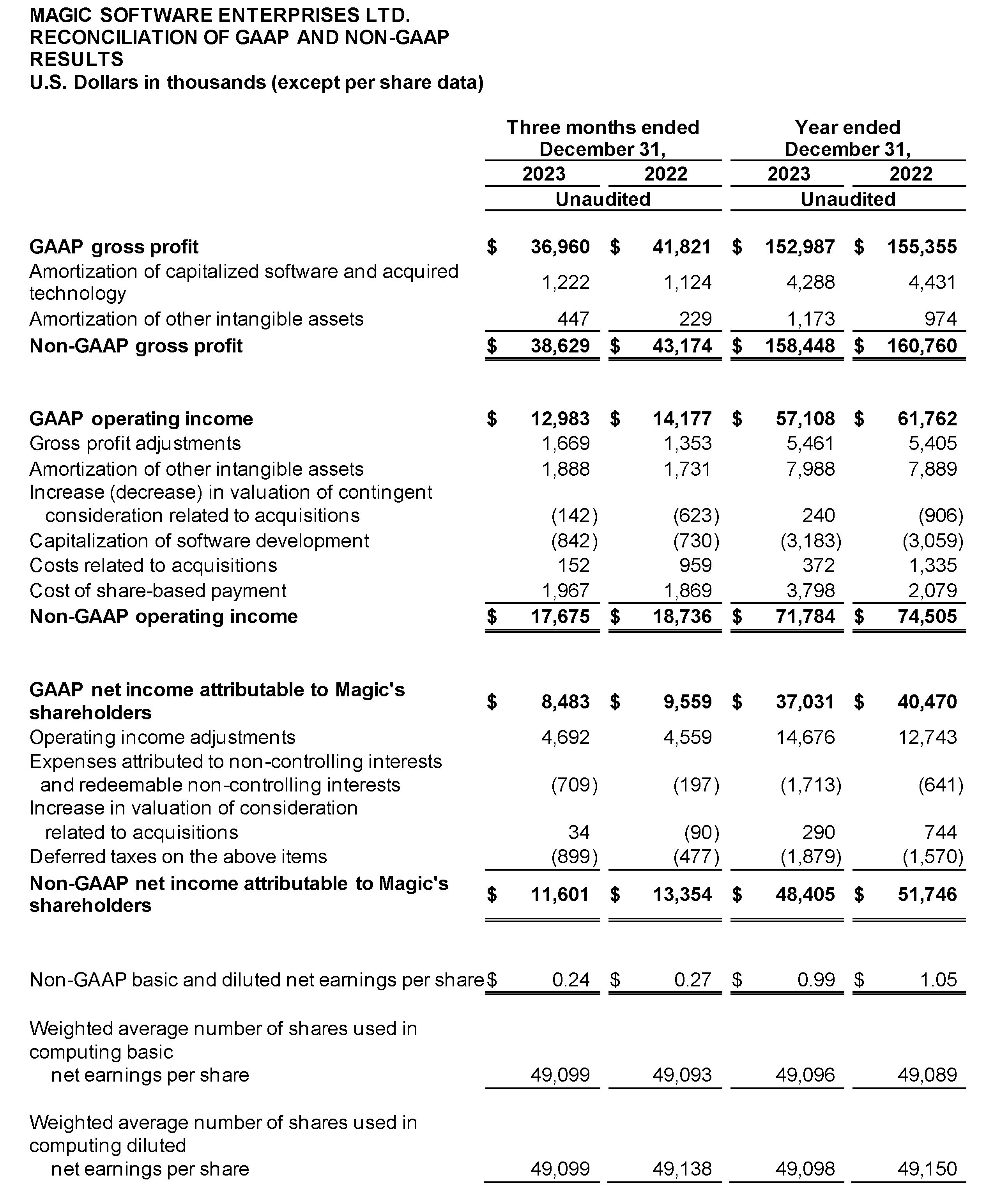 This press release contains the following non-GAAP financial measures: non-GAAP gross profit, non-GAAP operating income, non-GAAP net income attributable to Magic Software’s shareholders and non-GAAP basic and diluted earnings per share.