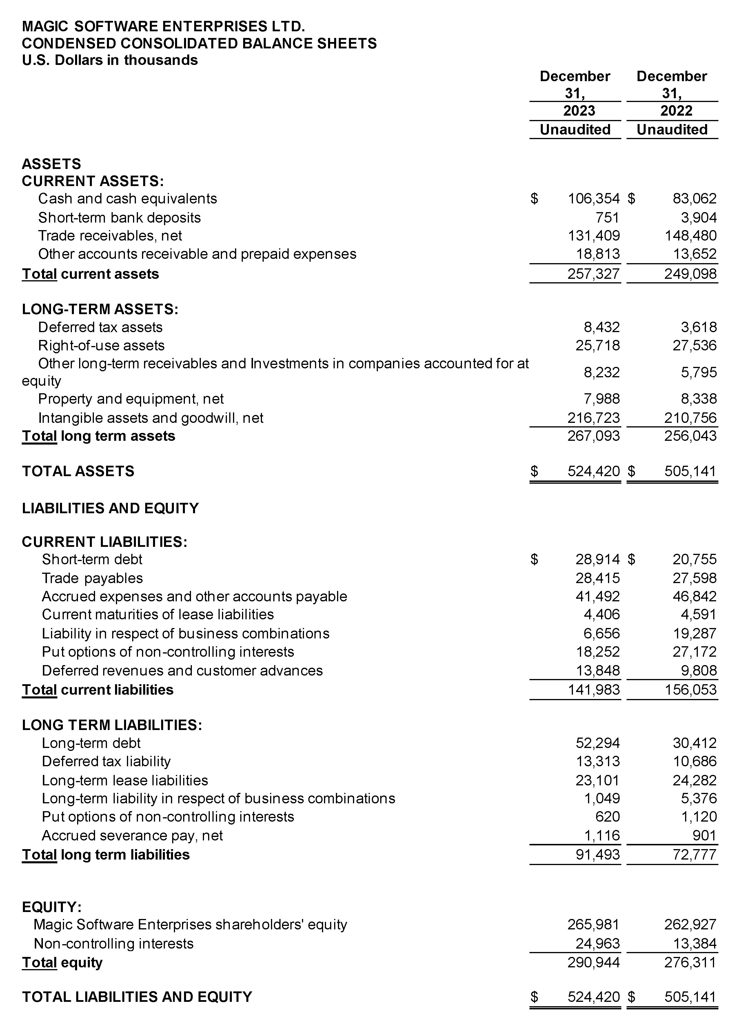 • Magic is introducing 2024 annual revenue guidance of between $540 million and $550 million (based on current currency exchange rates). Measured against Magic Software’s annualized 2023 fourth quarter revenue on a go-forward basis, the 2024 annual revenue guidance reflects an annual growth of 7.5% to 9.5%.