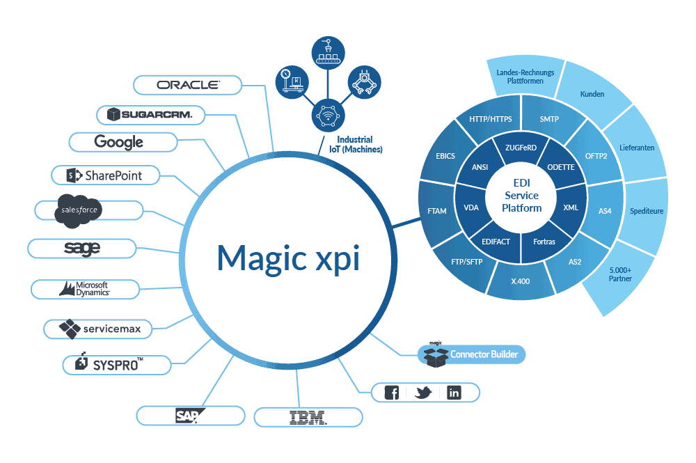 La plateforme d’intégration Magic xpi inclut Magic EDI en option, et vous propose également des options d’intégration et d’automatisation supplémentaires afin de contrôler tous les flux de données dans votre entreprise via une plateforme d’intégration modulaire, ajoutant des fonctionnalités automatiques aux échanges commerciaux.