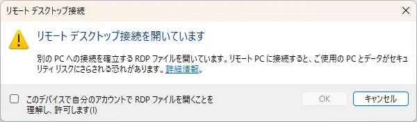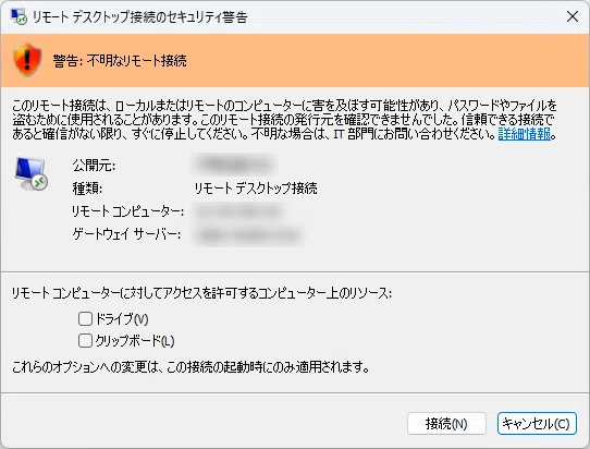 Windowsの標準リモートデスクトップ接続でも以下のようなダイアログが表示されるようになっております。