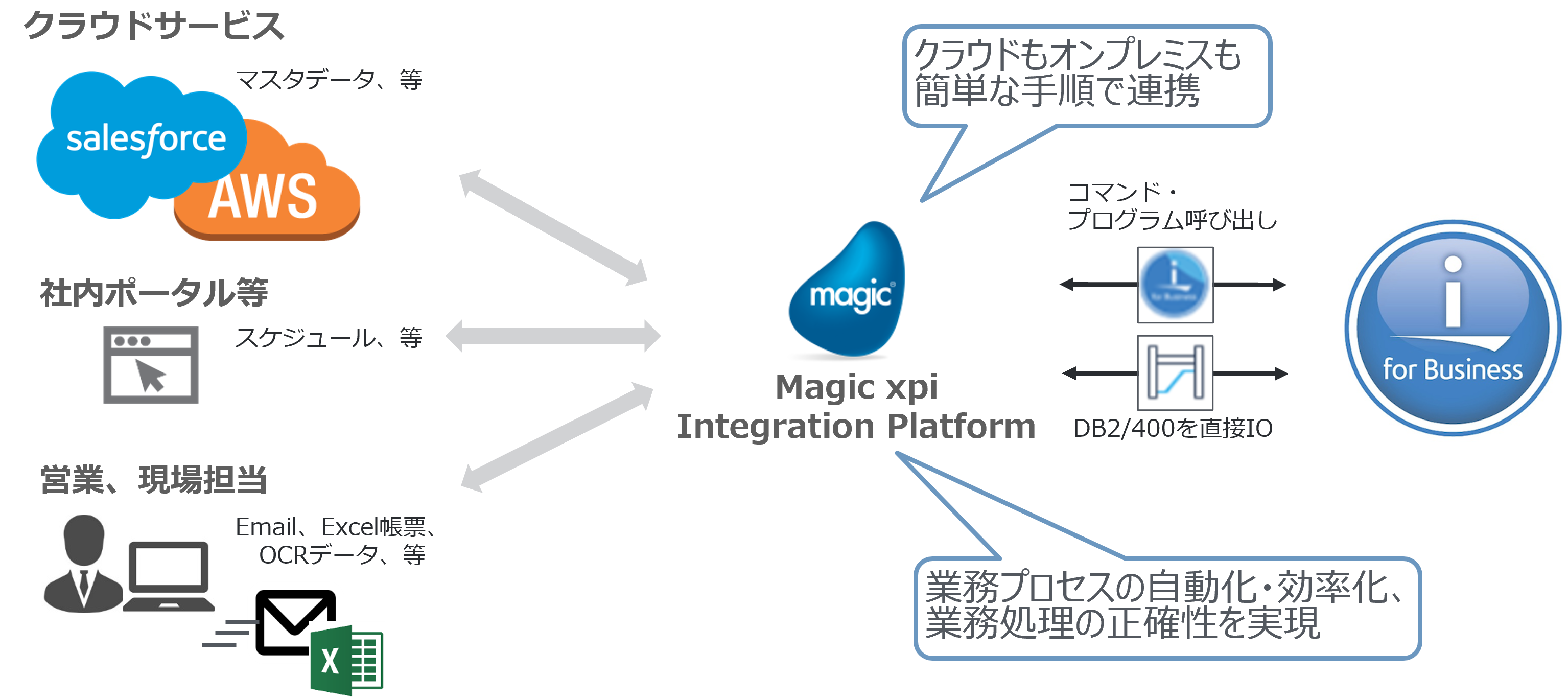 IBM iやDB2/400と他のシステムを連携し業務プロセスを自動化するために、Magic xpiを活用することができます。営業や現場担当者が使いやすいアプリケーションやクラウドサービスから、IBM iのデータやアプリケーションの処理結果を受け取り、業務を効率化することができるようになります。