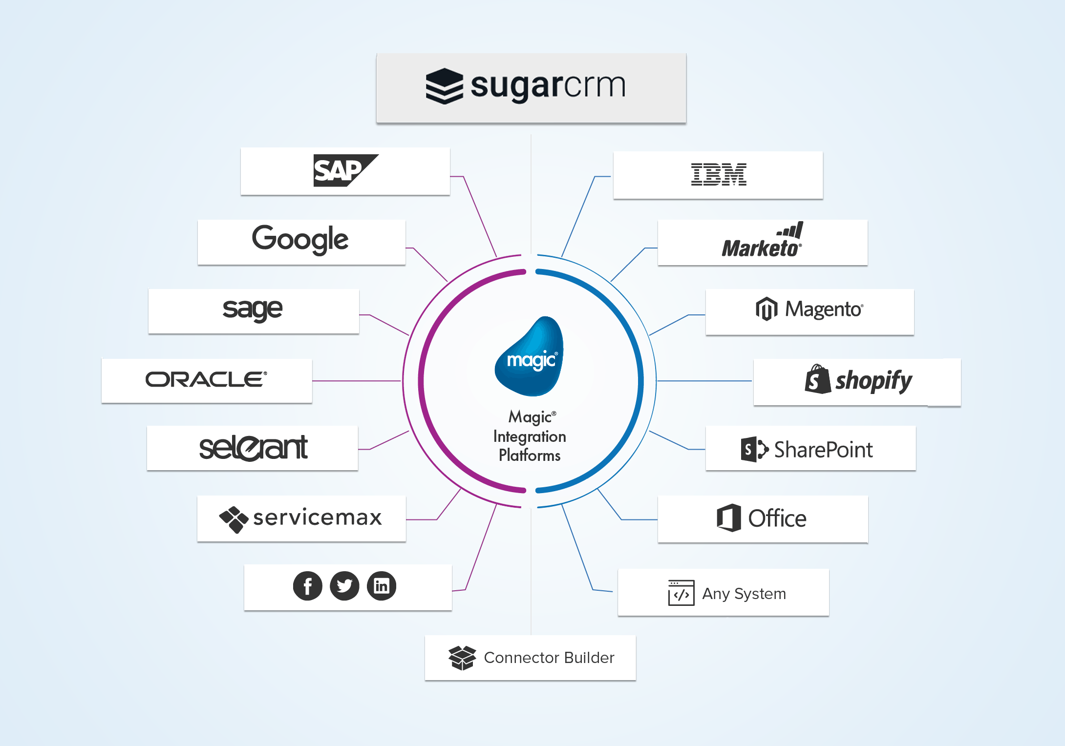 Magic xpi Integration Platform connecting SugarcRM, SAP, Google, sage, Oracle, selerant, servicemax, social media, IBM, Marketo, Magento, shopify, SharePoint, Office and a Connector Builder