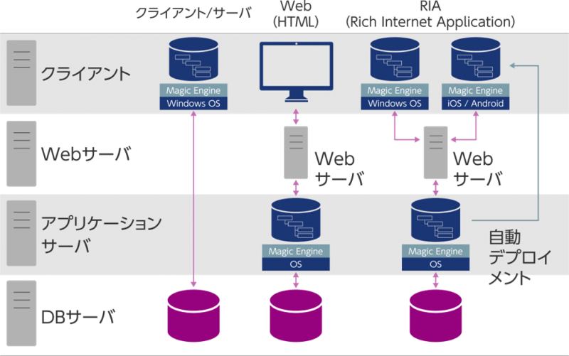 Magic xpaは、一つの開発環境と開発手法でクライアント/サーバ、Webアプリケーション、RIA(Rich Internet Application)、モバイルRIAを構築できます。