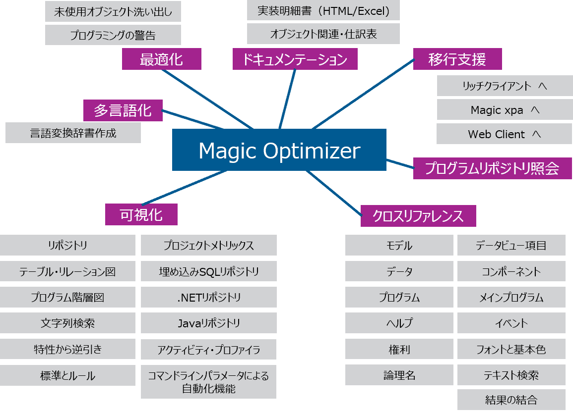 プログラムの分析・最適化・可視化機能は、未使用オブジェクトの抽出や、潜在的なプログラム不具合、パフォーマンスボトルネックの分析、ユーザーインタフェース不揃い等の確認作業を大幅に短縮し、プログラミング工程での品質を向上し標準化工数を削減します。