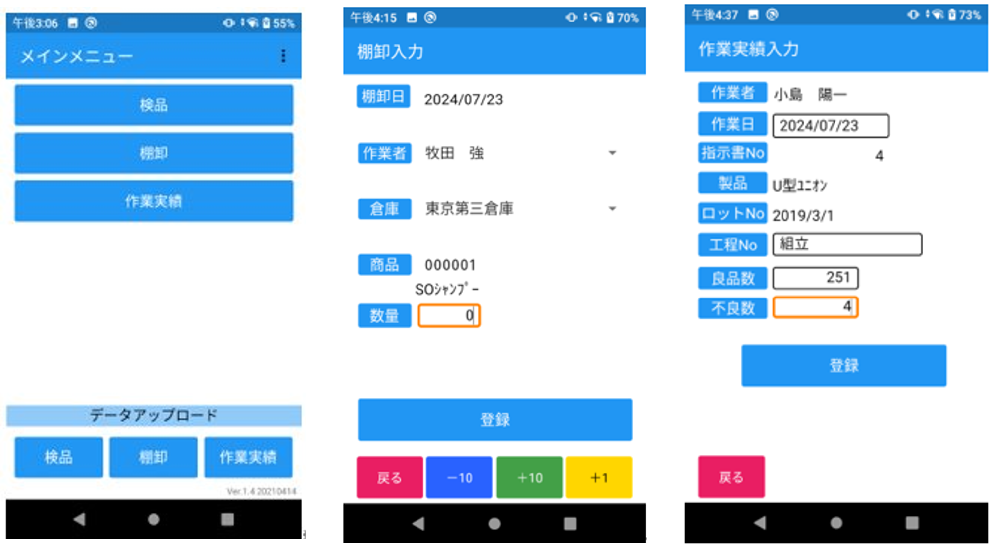 「棚卸」「検品」「作業実績」の3種類のアプリケーション