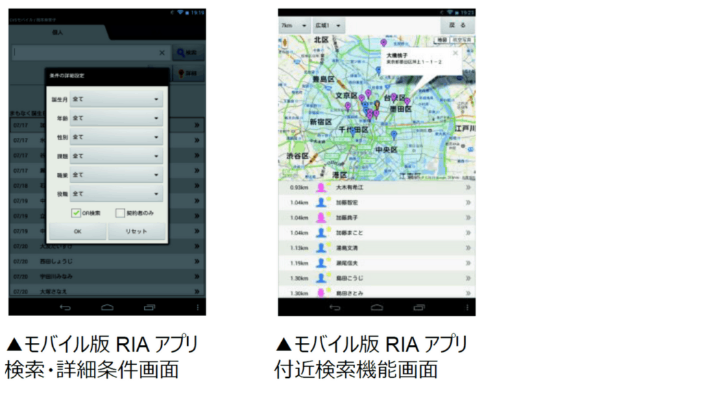 そうして開発されたモバイル版RIAアプリケーションは主に、外出先で顧客情報の参照や顧客への商品説明に活用されています。