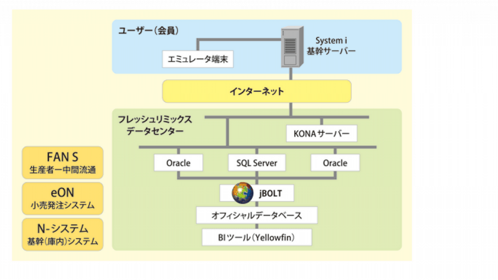 構築中のシステムは、各システムのOracle、SQL Serverなどのデータを jBOLTが収集し、それをオフィシャルデータベースへ蓄積し、ユーザーが BIツール「Yellow fin」(京セラ丸善システムインテグレーション)を使って分析する仕組みになる予定です。
