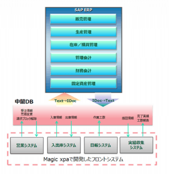 “ノンカスタマイズのERPシステムと『Magic xpa』で設計開発したフロントシステムを連携するに当たり、ERPシステムの外側にフロントシステム用の中間DBを作成し、中間DBを介してERPとフロントシステムのデータの送受信を行う手法を採用しました。