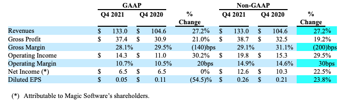 Guy Bernstein, Chief Executive Officer of Magic Software, said: “Magic Software finished the year strong, with record-breaking fourth quarter revenue of $133.0 million, growing 27.2% year over year, exceeding market expectations and with non-GAAP operating margin of 14.9% reflecting our ability to maintain profitability despite the costs increase that our industry and many sectors are facing. I am very proud of what we accomplished during 2021, with Digital Transformation programs at enterprises becoming increasingly important. We are witnessing a healthy demand and developing a growing pipeline to deliver continued growth in 2022 as our customers increasingly engage us as a preferred partner for digital transformation initiatives.”