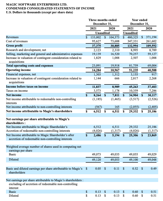 - Net income attributable to Magic Software’s shareholders for the fourth quarter of 2021 remained constant at $6.5 million, or $0.05 per fully diluted share, compared to $6.5 million, or $0.11 per fully diluted share in the same period last year. Diluted earnings per share for the fourth quarter of 2021 and 2020 include a negative impact of $0.08 and $0.02, respectively, resulting from accretion of redeemable non-controlling interests, recorded in retained earnings. Excluding the impact of accretion of redeemable non-controlling interests, diluted earnings per share for the fourth quarter of 2021 amounted to $0.13 compared to $0.13 in the same period of the previous year.