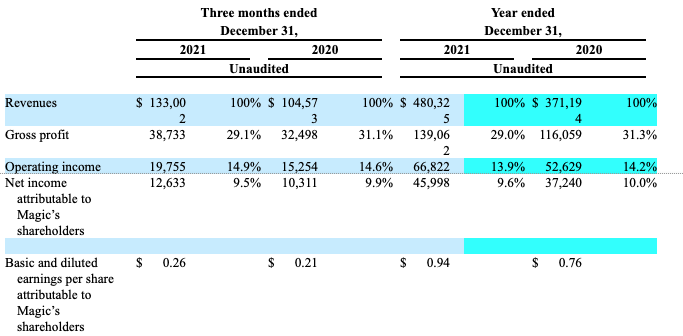 - Magic is providing revenue guidance for 2022 of between $535 million to $545 million, reflecting annual growth of 11.5% to 13.5%