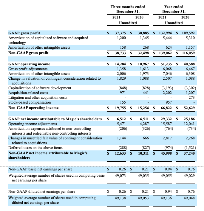 - Non-GAAP net income attributable to Magic Software’s shareholders for the fourth quarter of 2021 increased 22.5% to a record breaking $12.6 million, or $0.26 per fully diluted share, compared to $10.3 million, or $0.21 per fully diluted share, in the same period of the previous year.