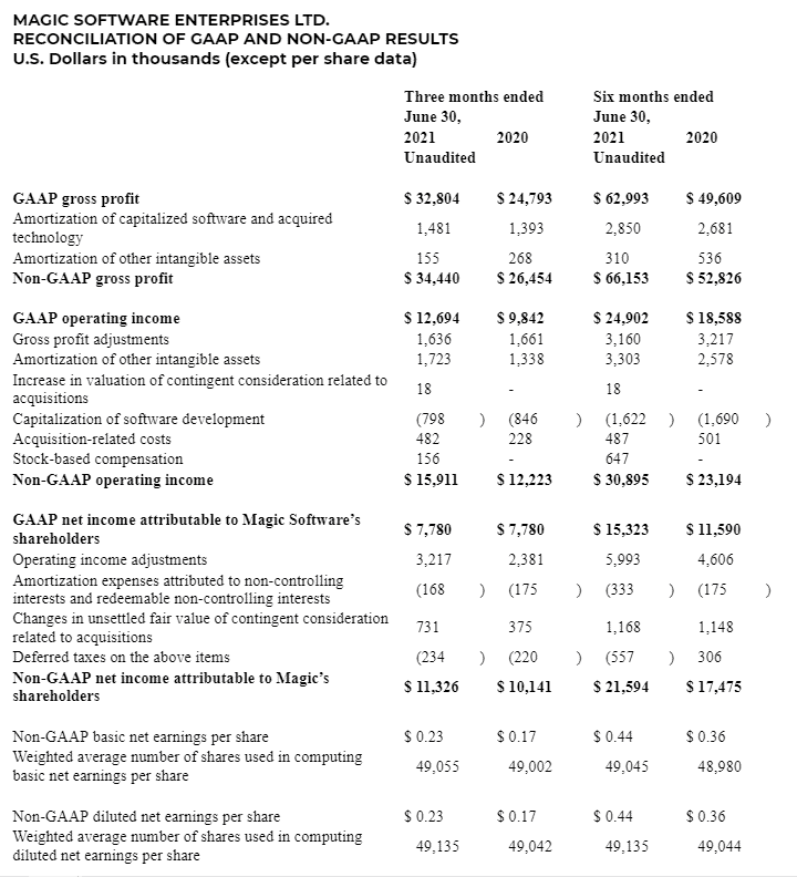 • Non-GAAP net income attributable to Magic Software’s shareholders for the second quarter ended June 30, 2021 increased 39.9% to $11.3 million, or $0.23 per fully diluted share, compared to $8.1 million, or $0.17 per fully diluted share, in the same period last year.