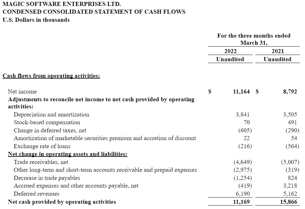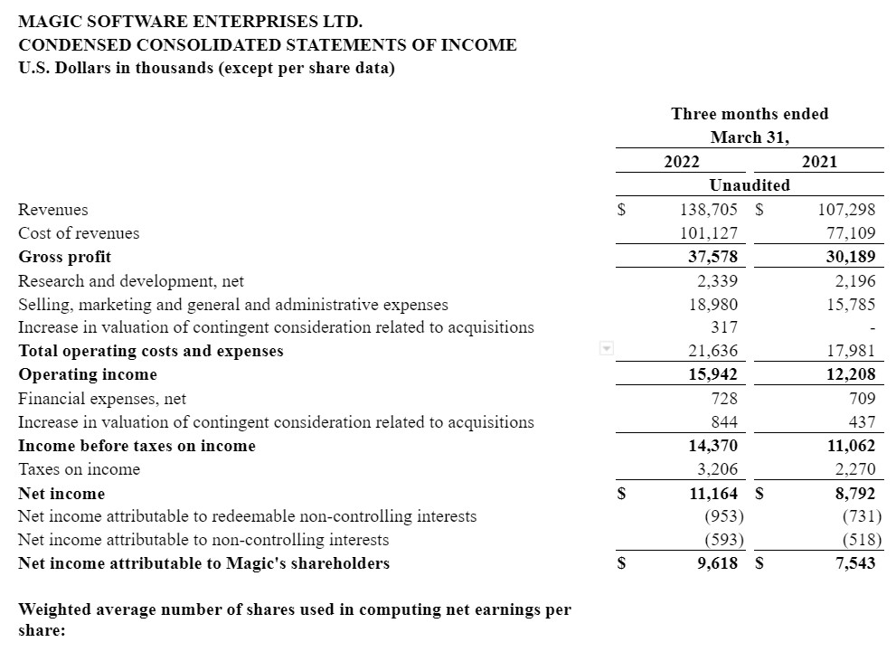 • Net income attributable to Magic Software’s shareholders for the first quarter of 2022 increased 27.5% to a record-breaking quarterly result of $9.6 million, or $0.2 per fully diluted share, compared to $7.5 million, or $0.15 per fully diluted share, in the same period of the previous year.