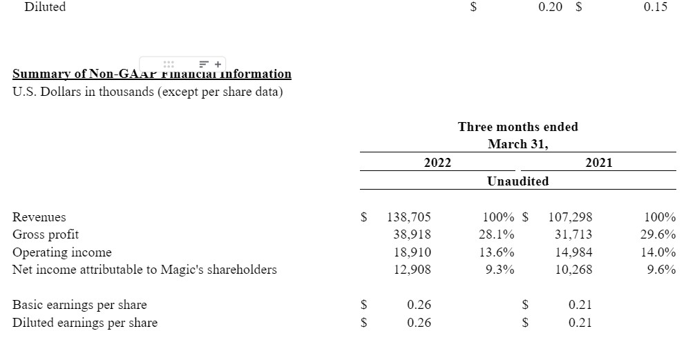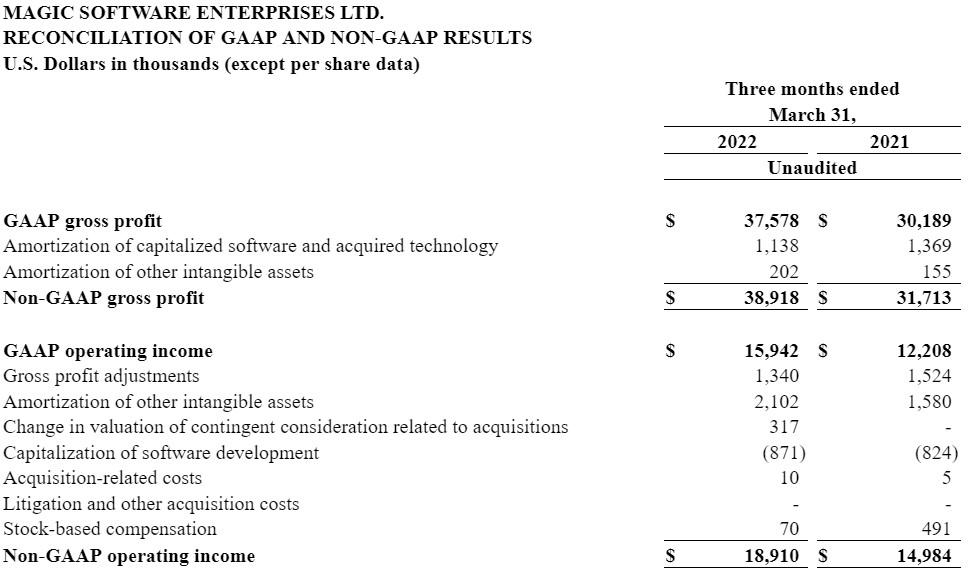 - Non-GAAP net income attributable to Magic Software’s shareholders for the first quarter of 2022 increased 25.7% to a record-breaking quarterly result of $12.9 million, or $0.26 per fully diluted share, compared to $10.3 million, or $0.21 per fully diluted share, in the same period of the previous year.
