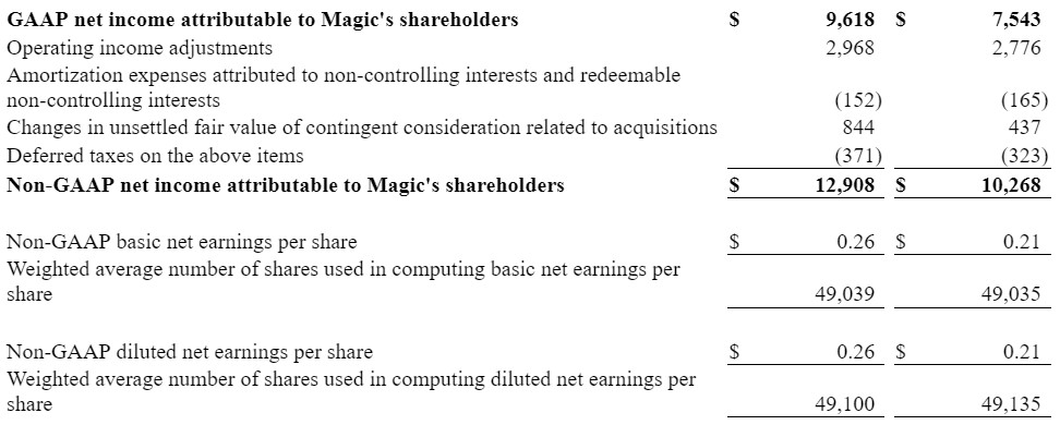 This press release contains the following non-GAAP financial measures: non-GAAP gross profit, non-GAAP operating income, non-GAAP net income attributable to Magic Software’s shareholders and non-GAAP basic and diluted earnings per share.