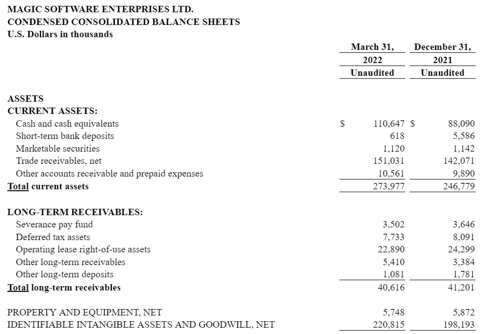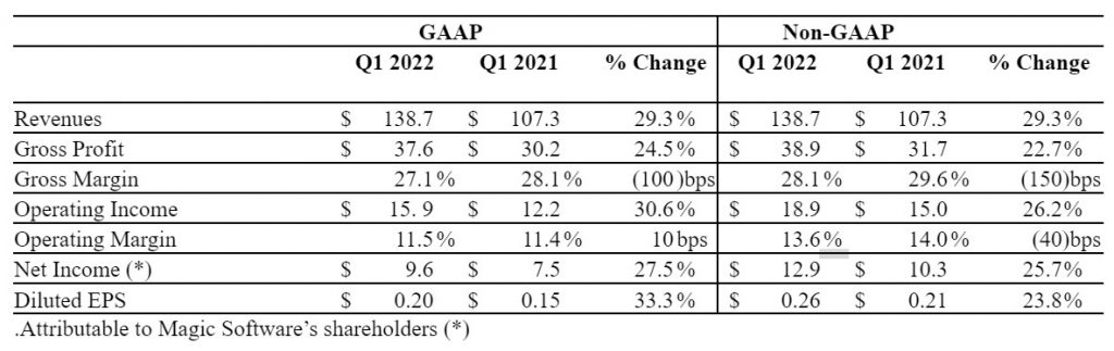 Guy Bernstein, Chief Executive Officer of Magic Software, said: “We are proud of our outstanding performance in the first quarter, reflecting continued positive business momentum and exceeding market expectations as we reported record-breaking revenues of $138.7 million, growing 29.3% year over year, and with non-GAAP operating income of $18.9 million. Our solid execution in the first quarter validates our strategy of building a broad business portfolio, which provides the foundation for our continued solid performance and growth. We are witnessing a healthy demand and developing a growing pipeline to deliver continued growth in 2022 as our customers increasingly engage us as a preferred partner for digital transformation initiatives.”